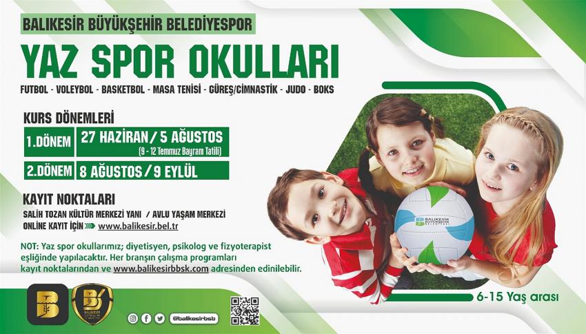 Balıkesir Büyükşehir Belediyesi tarafından yaz döneminde, basketboldan jimnastiğe kadar 8 farklı branşta ücretsiz verilecek yaz spor okulları için kayıtlar başladı. 27 Haziran’da başlayacak olan Yaz Spor Okulları 9 Eylül’e kadar iki dönem halinde yapılacak.
