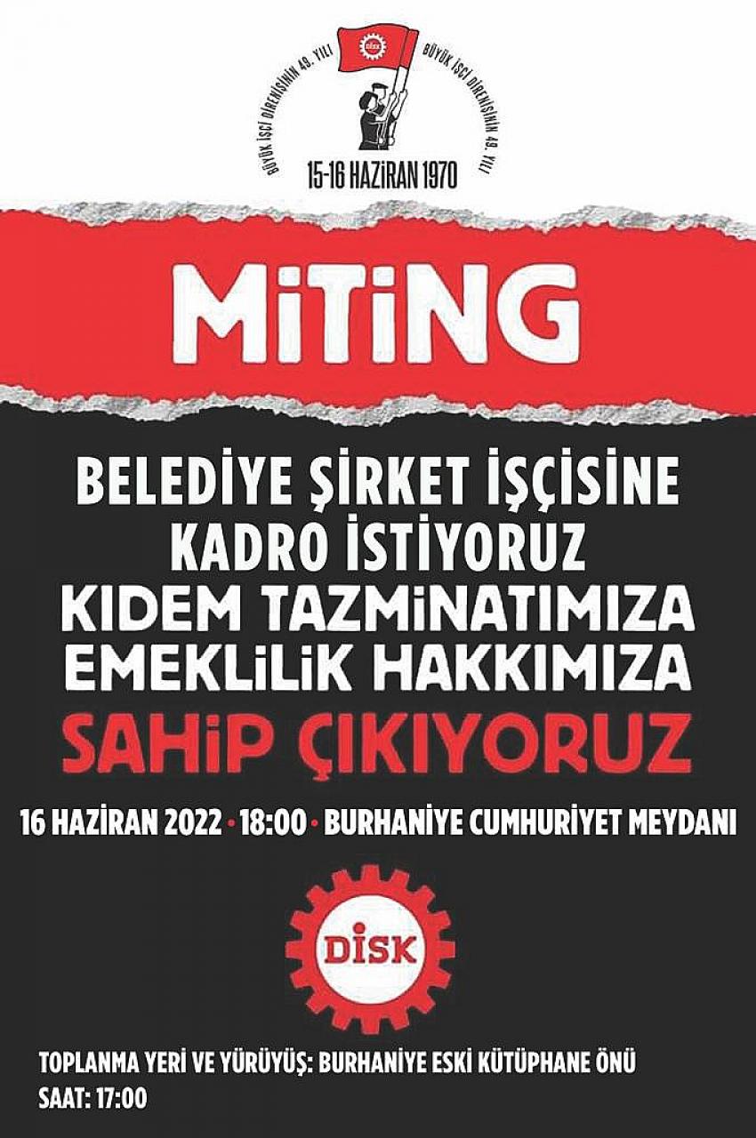 15-16 Haziran 1970 tarihinde DİSK’in o kapatılmaya çalışılmasına karşı DİSK’in öncülüğünde büyük işçi direnişinin yıldönümünde işçiler Burhaniye’de taleplerini anlatacak. 16 Haziran Perşembe günü saat 17.00’de Burhaniye eski kütüphane önünden başlayarak Cumhuriyet Meydanı’nda son bulacak yürüyüş ve ardından gerçekleştirilecek mitingde işçiler, belediye şirket işçilerine kadro, kıdem tazminatı ve emeklilik hakkı başta olmak üzere taleplerini kamuoyuna haykıracak.
