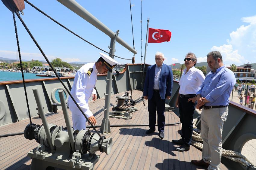 Nusret’in Çanakkale Zaferi’ndeki kahramanca mücadelesi, o dönemin kaptanları, kamara dairesi, mürettebatın yaşam alanları ve mayınların kullanımı hakkında bilgiler alan Başkan Deveciler’e Başkan Yardımcıları Tamer Midilli ve Murat Yazgan da eşlik etti.
