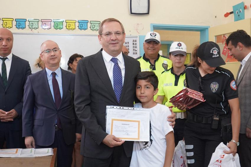 Minik öğrencilere karnelerini dağıtan Kaymakam Hasan Yaman ile Belediye Başkanı Mesut Ergin’in sempatik tavırları öğrencileri mutlu ettiği gözlendi.