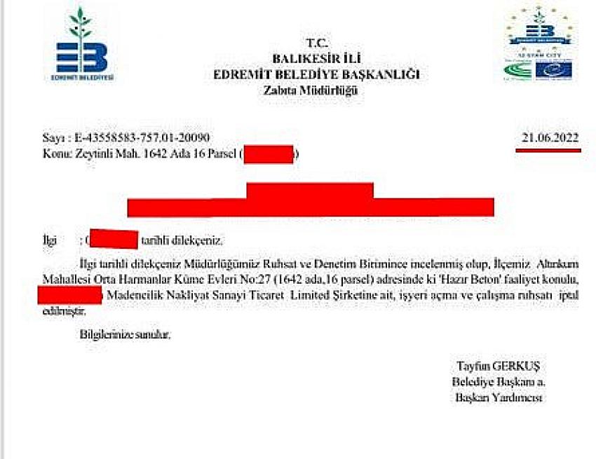 Edremit'te usulsüz bir şekilde açılan imar dışında kalan zeytinlik alanında kaçak bir şekilde faaliyet gösteren firmaya yargıdan kapatma ve yıkılma kararından sonra Edremit Belediyesin verdiği çalışma ruhsatı Belediye olarak iptal edildi.