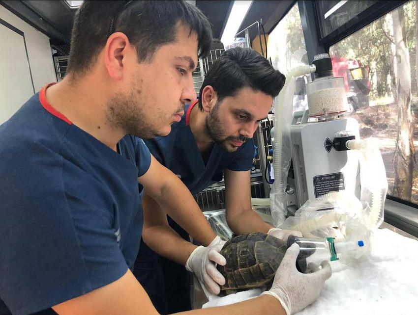 Balıkesir Büyükşehir Belediyesi VETBÜS ve VETBULANS’ı veterinerleri Marmaris’teki orman yangının olduğu bölgeye gider gitmez, karbonmonoksit zehirlenmesi yaşadığı tespit edilen kaplumbağayı oksijen tedavisi ile yeniden hayata döndürdü.
