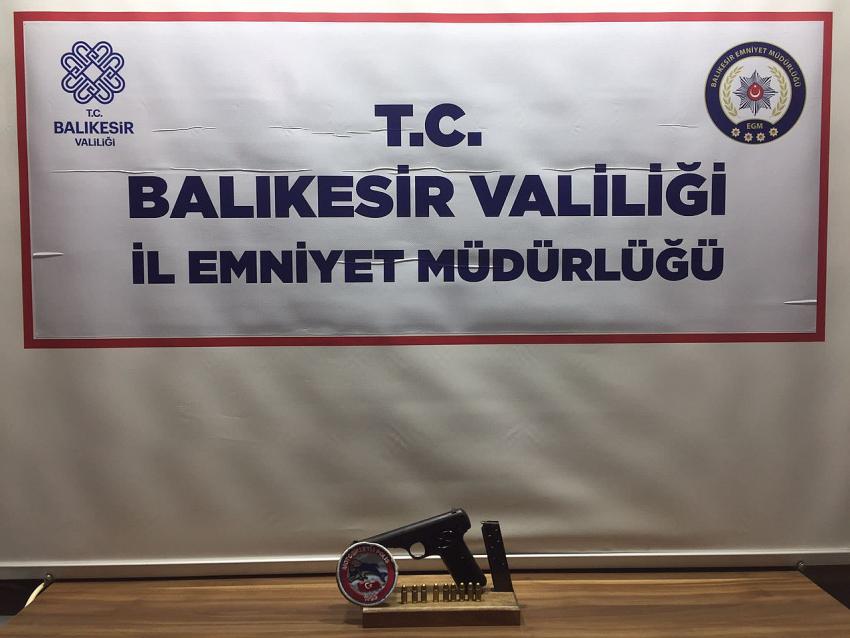 Balıkesir İl Emniyet Müdürlüğünce İl genel güvenliğini ve asayişi sağlamak amacıyla Asayiş Şube Müdürlüğü, Altıeylül, Karesi, Bandırma, Edremit ve Erdek ilçelerinde yapılan çalışmalarda (19) aranan şahıs yakalandı ve (6) şahıs tutuklandı. Yapılan aramalarda; (1) adet ruhsatsız tabanca ve bu tabancaya ait (8) adet fişek ve (1) adet kurusıkı tabanca ele geçirildi.