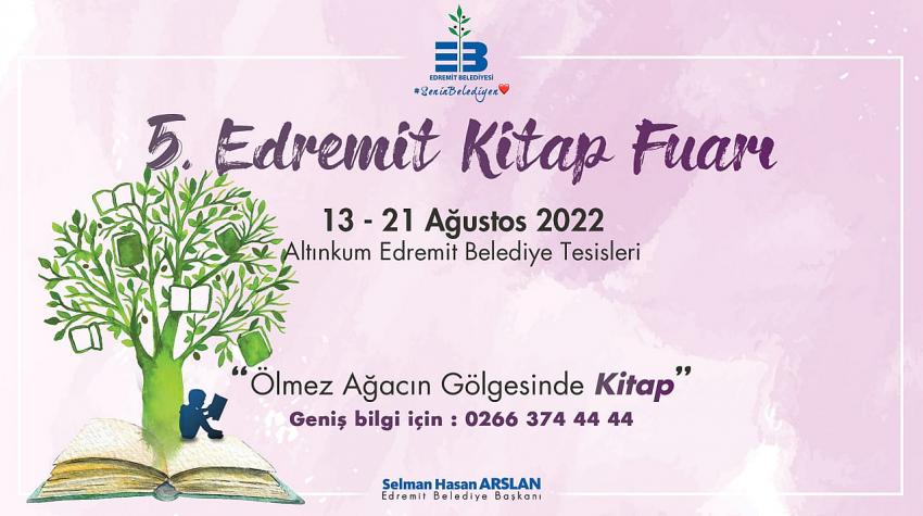 Edremit ve çevresinde geleneksel hale gelen Edremit Kitap Fuarı’nın beşincisi bu yıl 13-21 Ağustos tarihleri arasında yapılıyor. “Ölmez Ağacın Gölgesinde Kitap” sloganı ile yapılacak 5. Edremit Kitap Fuarı 13 Ağustos 2022 Cumartesi günü saat 19:00’da Edremit Altınkum Belediye Tesisleri’nde yapılacak açılış töreni ile başlayacak ve 9 gün sürecek. Fuara 200’e yakın konuk ve 60 yayınevi katılacak.
