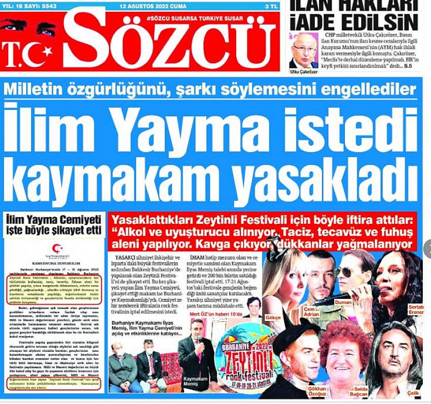 EgeTürk Tv olarak dün gündeme getirdiğimiz "Zeytinli Rock Festivalinin yasaklanmasının arkasında tarikatların parmağı mı var?" sorusu üzerine, Sözcü gazetesinin yapmış olduğu çalışmalar doğrultusunda "İlim Yayma Cemiyeti'nin" Burhaniye Kaymakamı İlyas Memiş'e yapmış olduğu şikayetler ve zehir zemberek açıklamalar ile zeytinli Rock festivalinin iptal edilmesini istediği ortaya çıktı