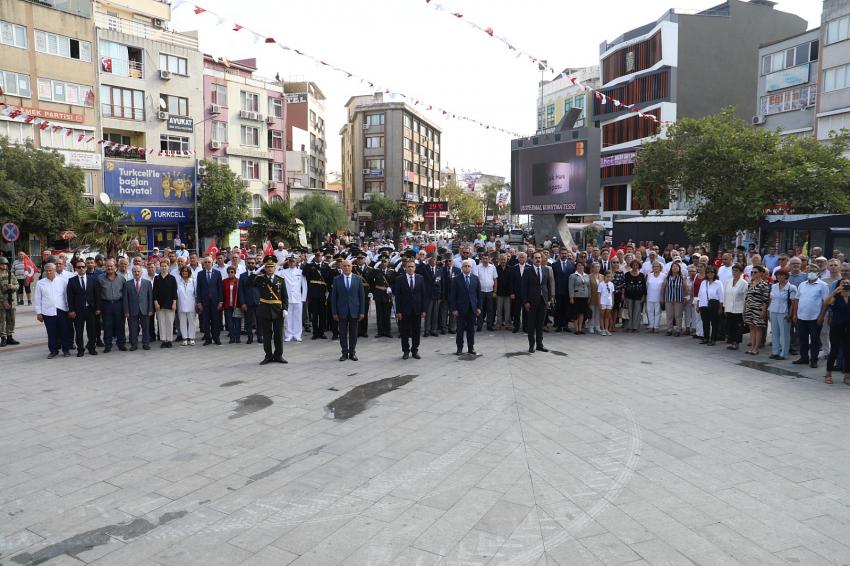 Burhaniye’de Zafer Bayramı kutlamaları ilk Kaymakamlık Makamında düzenlenen tebrikat ile başladı. Burhaniye Kaymakamı İlyas Memiş Belediye Başkanı Ali Kemal deveciler ve Garnizon Komutanı Mustafa Kıraç’ın tebrikleri kabulünden sonra Protokol Cumhuriyet Meydanında düzenlenen çelenk törenine katıldı.