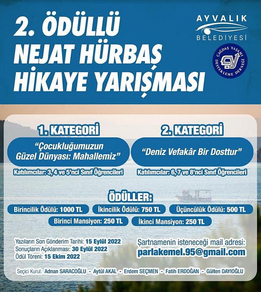 Ayvalık Belediyesi Çağdaş Yaşam Türkel Minibaş Gençlik ve Çocuk  Kütüphanesi’nin iki ayrı kategoride ikinci kez düzenlediği; Nejat Hürbaş Hikaye Yarışması’na son başvuru tarihi 15 Eylül.