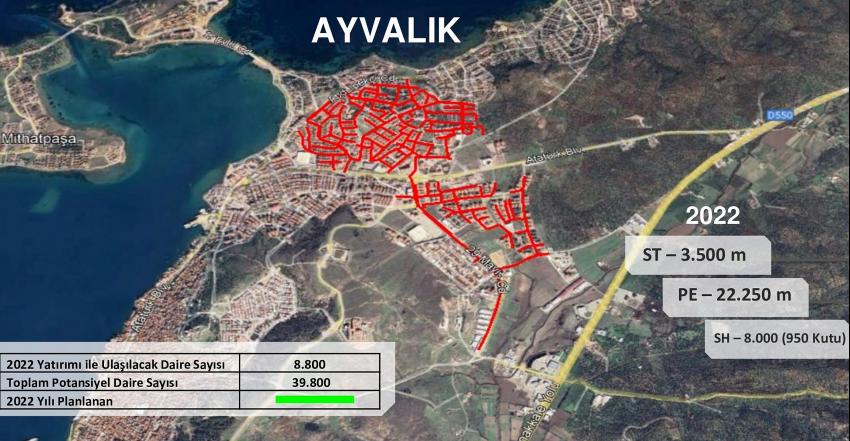 Aksa Balıkesir Doğalgaz Dağıtım A.Ş şirketinde İşletme Müdürü Levent Üstüner yaptığı sunumda müjdeyi verdi ve “Eylül ayı içinde başlayacak olan çalışmalarla 150 Evler, Ali Çetinkaya ve Sahilkent mahallerinden başlayarak tüm Ayvalık doğalgaz konforuyla tanışacak. Öncelikli bu üç mahalle yeni yıla doğalgazla ısınarak girecek. Boru Hatları İle Petrol Taşıma Anonim Şirketi’nin (BOTAŞ) belirlenin programında bir aksama olmadığı sürece belirlenen tarihlerde akım başlayacak” dedi.