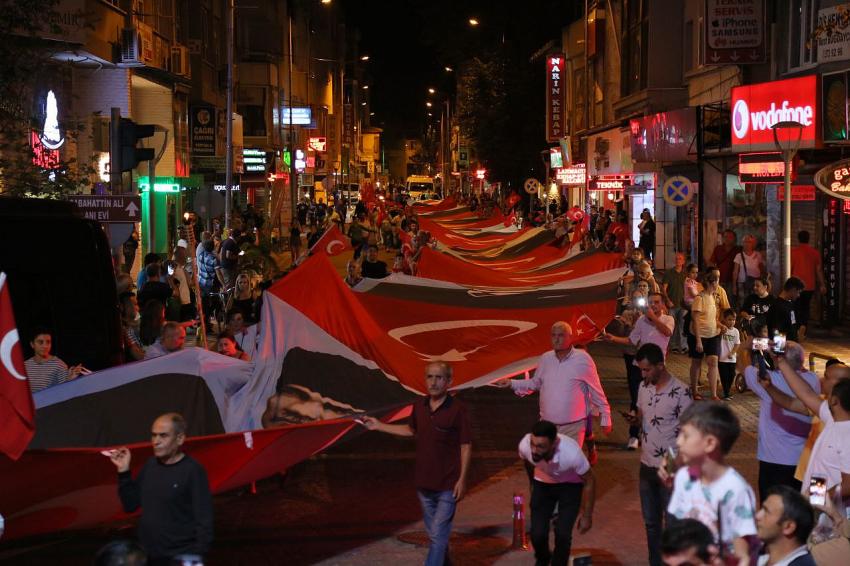Sabah ilçe merkezinde ki resmi törenlerin ardından Tuzcumurat Mahallesi’nden Cumhuriyet Meydanı’na fener alayı düzenlendi. Gümrük Meydanı’ndan toplanan binlerce kişi ellerinde meşale ve bayraklarla Çayiçi Caddesi’ni takip ederek Cumhuriyet Meydanı’na kadar yürüdü.
