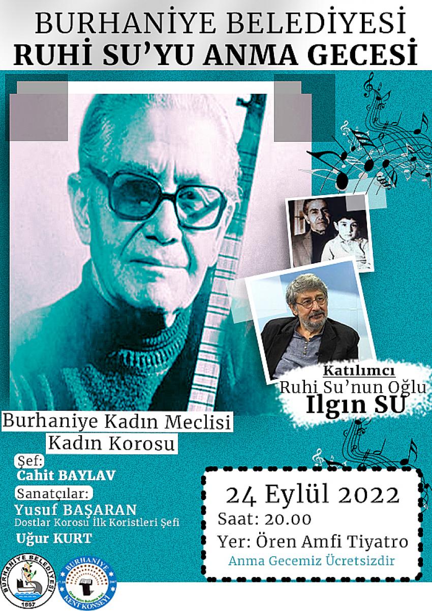 Ruhi Su’nun hayatını, türkülerini ve müziğimize katkılarını anlatılacağı gecede, Oğlu Ilgın Su ve Dostlar Korosu İlk Koristleri Şefi Yusuf Başaran ile Burhaniye Kadın Meclisi Korosundan Ruhi Su türküleri dinletisi katılımcılara sunulacak.