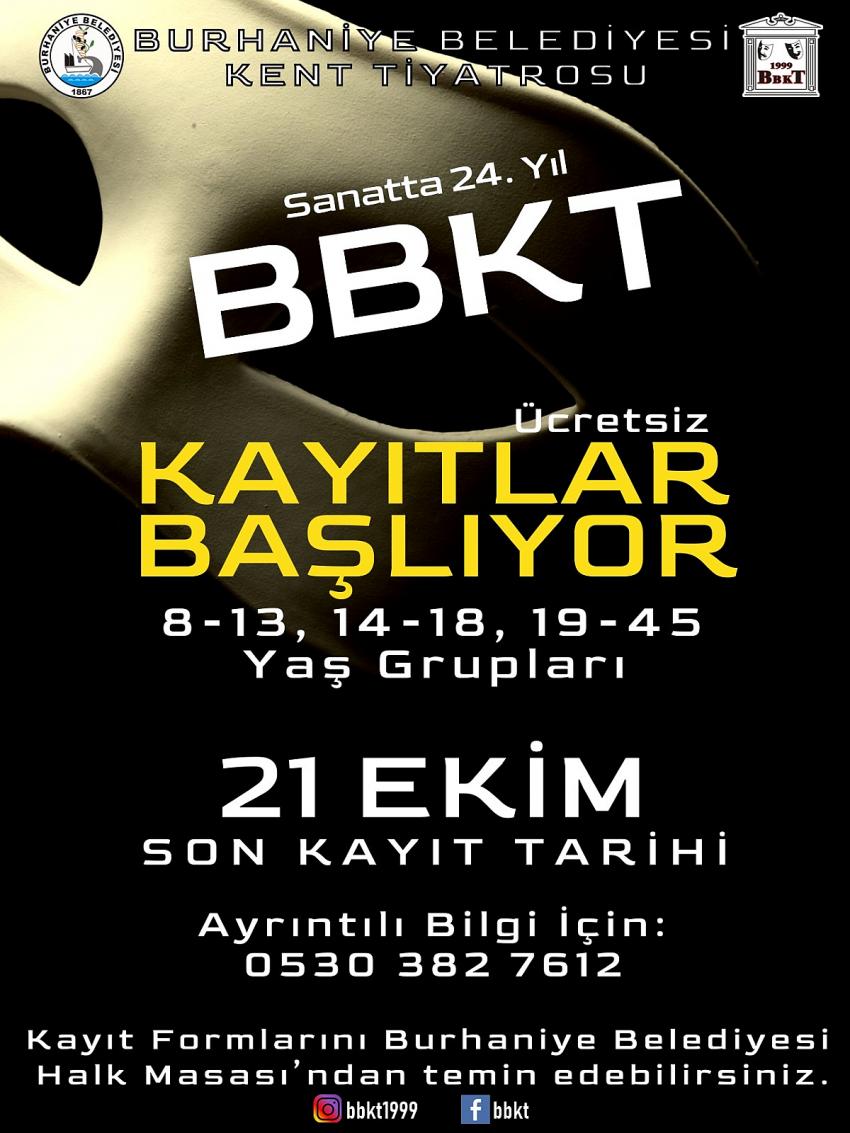 Sanat hayatı boyunca, televizyon ve sahnelere pek çok ünlü de yetiştiren, yönetmen, yazar, görüntü yönetmeni ve cast direktörü olmak üzere 20’nin üzerinde sanatçıyı profesyonel sahnelere gönderen BBKT (Burhaniye Belediyesi Kent Tiyatrosu) kayıtlarına 8 ile 45 yaş arasındaki tüm tiyatroseverler başvurabilecek.