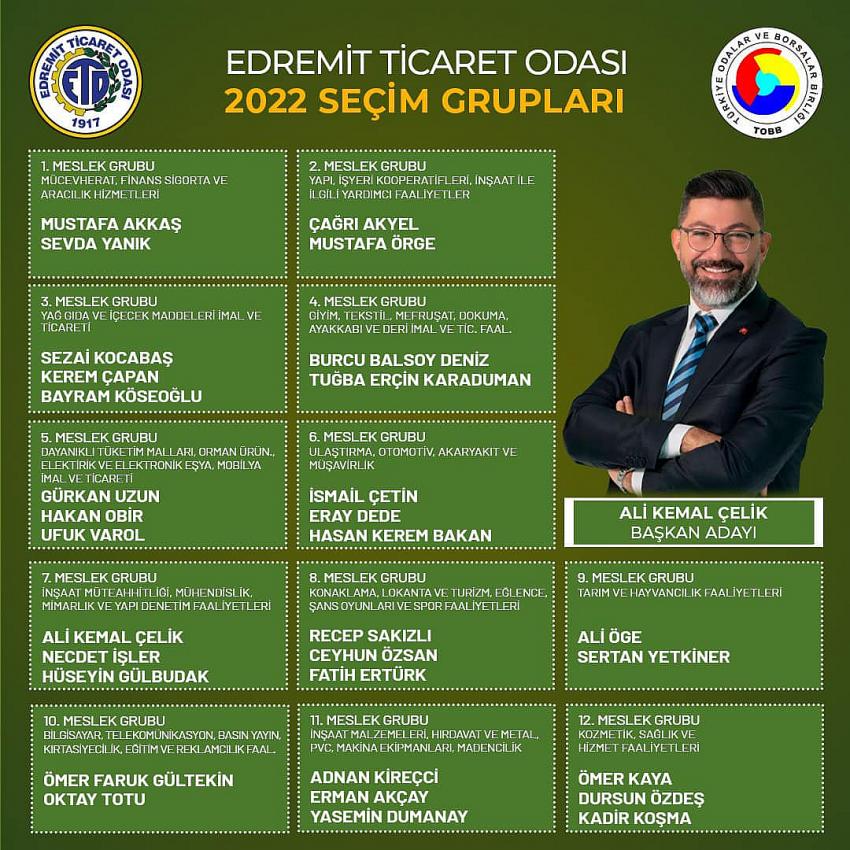 Yaklaşan Edremit Ticaret Odası Başkanlık seçimlerinde daha önce de adaylığını açıklayan Ali Kemal Çelik, "Yeşil Liste" Olarak Adlandırılan ekibin meslek gruplarını ve bu meslek gruplarda yer alan kişileri açıklandı...