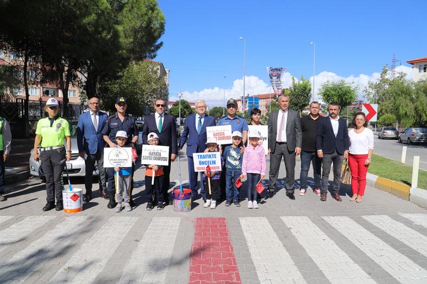Burhaniye Saip Hoca Bulvarında okul önünde İlçe protokolü tarafından yaya geçidinde bir çizgi kırmızı renge boyandı. Burhaniye Kaymakamı İlyas Memiş’in rulo ile boyayarak başlattığı uygulamada farkındalık oluşturularak dikkat çekildi.
