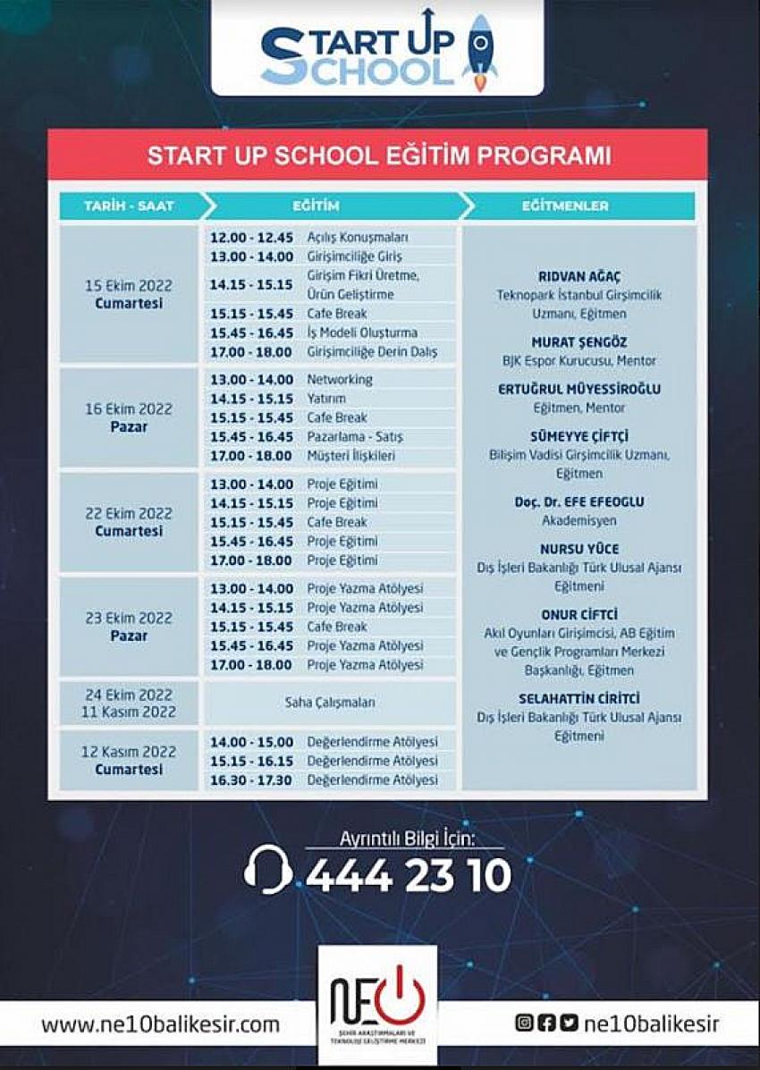 Balıkesir Büyükşehir Belediyesi Ne10 Şehir Araştırmaları ve Teknoloji Geliştirme Merkezi’nin düzenlediği; gençlerin girişimcilik alanında eğitim aldıkları, fikirlerini projelendirip, deneyim kazandıkları bir girişimcilik eğitim programı olan Start-Up School başladı. Açılışı gerçekleştirilen programa birçok öğrenci ve eğitmen katıldı. Gençlere; girişimcilik ruhu kazandırmak, eğitimlerle alan bilgi seviyelerini artırmak, fikirlerini üretime dönüştürecek cesaret, girişimcilik ekosistemine dâhil olmasını sağlayacak donanımlar ve deneyim aktarımı ile sektörel tecrübe kazandırmayı amaçlayan program kapsamında lise ve üniversite öğrencilerine, 5 hafta boyunca alanında uzman kişiler tarafından eğitimler verilecek. Eğitimlerde öğrenciler; uygulama atölyeleri ile fikirlerini yazılı hale dönüştürebilecek, saha deneyimi kazanacak ve ekip ruhu ile hareket edebilmeyi öğrenecek.