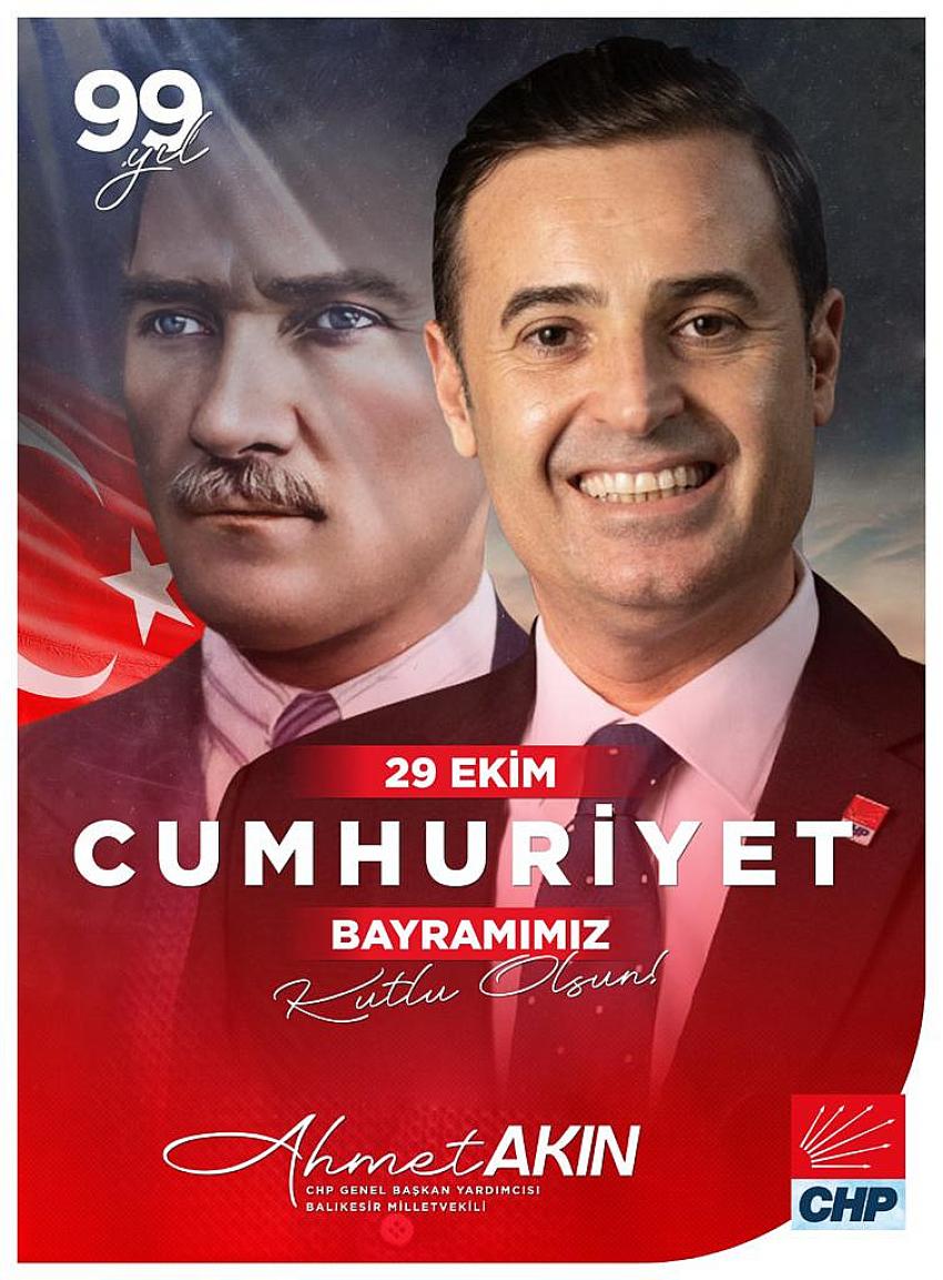 CHP Genel Başkan Yardımcısı ve Balıkesir Milletvekili Ahmet Akın, 29 Ekim Cumhuriyet Bayramı’nı kutladı. Cumhuriyet’in Gazi Mustafa Kemal Atatürk tarafından Türk Milletine bırakılmış en büyük miras olduğunu vurgulayan Ahmet Akın, “Cumhuriyet için yürekleri çarpan Milletimiz, eşitlik ve kardeşlik için, adalet ve özgürlük için yılmadan mücadele ederken mirasına sonsuza kadar sahip çıkacaktır” dedi.