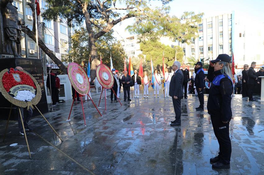 Kaymakamlık, Garnizon Komutanlığı, Belediye ile siyasi partilerin ve sivil toplum örgütlerinin çelenklerinin Atatürk Anıtı’na koyulmasının ardından saat 9’u 5 geçe iki dakikalık saygı duruşu, ardından İstiklal Marşı okundu.