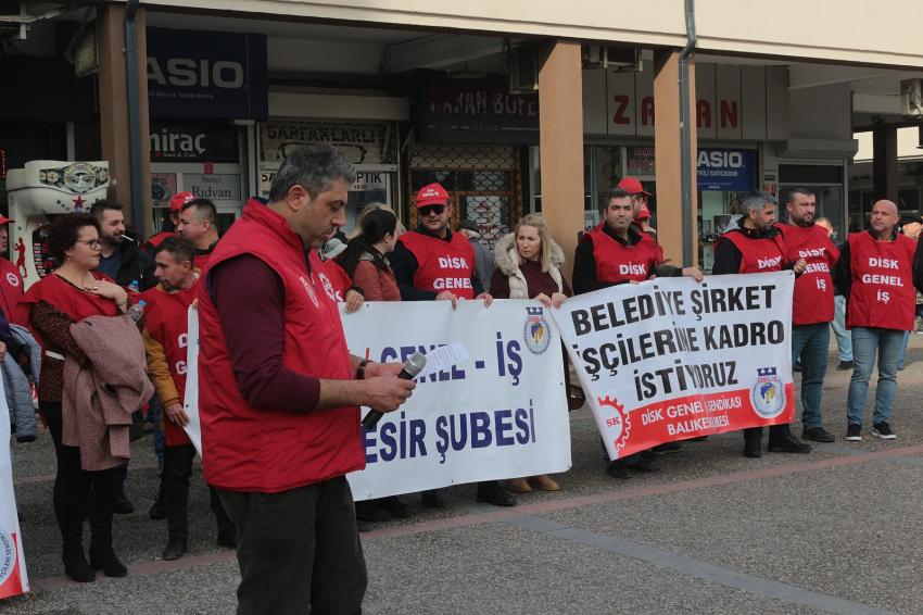 DİSK’e bağlı Genel-İş Sendikası Balıkesir Şube Başkanı Hüseyin Ovalı, Ali Hikmet Paşa Meydanı’nda basın açıklamasında “Belediye Şirket İşçilerine Kadro hakkı ertelenebilecek ya da seçimlerden sonraya bırakılabilecek bir konu değildir. Sendikamız Belediye Şirket işçileri ile birlikte bu meseleyi esaslı olarak takip etmekte hükümetten bu konuda bir sonuca gitmelerini istemektedir. Buradan tekrar ediyorum Anamızın Ak sütü gibi helal olan kadro hakkımızı 2023 seçimlerinden önce istiyoruz” dedi.