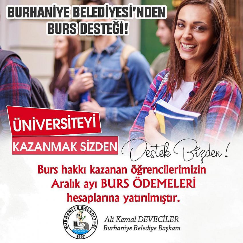 Dar gelirli öğrenci ve ailelerine eğitim desteği sözü veren Burhaniye Belediye Başkanı Ali Kemal Deveciler, üniversite öğrencilerine eğitim desteği projesinin ilk yılında 400 tl olan aylık burs ücretini bu eğitim öğretim döneminde artış yaparak 650 tl olarak belirlemişti. Zorlaşan hayat şartları içinde üniversite öğrencilerine nefes olan; her ay düzenli yatırılan bursların Aralık ayı ödemesi öğrencilerin hesaplarına yatırıldı.