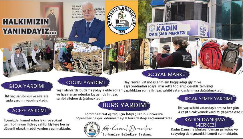 Her gün yaklaşık 400 haneye sıcak yemek yardımı ile 4 çeşit yemeği evlerine ulaştıran Burhaniye Belediyesi, İhtiyaç sahibi yaklaşık 500 ailenin bebekleri için bebek bezi yardımının yanı sıra; her yıl 10 bin çuval yakacak odun yardımıyla ihtiyacı olan hanelerin bacalarını tüttürülüyor. İhtiyacı olan ailelere ev eşyalarını da toplanan bağış eşyalar ile karşılayan Burhaniye Belediyesi, ilçede eğitim gören ihtiyaç sahibi öğrencilerin okul kıyafeti, ayakkabı ve kırtasiye malzemelerini de karşılıyor. Askere giden gençlere de asker ödemesi yapan Belediye, üniversitede okuyan 250 öğrenciye de her ay 650 TL burs vererek gençlerin yanında olduğunu gösteriyor.