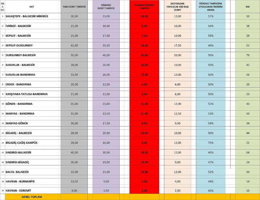 Savaştepe – Balıkesir 23 TL’den 10 TL’ye, İvrindi – Balıkesir 18’TL’den 8 TL’ye, Kepsut – Balıkesir 17’TL’den 7 TL’ye, Kepsut – Dursunbey 35,5’TL’den 18 TL’ye, Dursunbey – Balıkesir 40’TL’den 20 TL’ye, Susurluk – Balıkesir 20’TL’den 10TL’ye, Susurluk-Bandırma 26 TL’den 13 TL’ye, Erdek – Bandırma 12 TL’den 6 TL’ye, Karşıyaka – Tatlısu – Bandırma 12 TL’den 6 TL’ye, Gönen – Bandırma 23 TL’den 11,50 TL’ye, Manyas – Bandırma 23.50 TL’den 11,75 TL’ye, Manyas-Gönen 17.50 TL’den 8,75 TL’ye, Bigadiç – Balıkesir 28 TL’den 10 TL’ye, Bigadiç Çağış Kampüs 16 TL’den 4 TL’ye, Sındırgı – Balıkesir 30 TL’den 18 TL’ye, Sındırgı – Bigadiç 19 TL’den 10 TL’ye, Balya-Balıkesir 25 TL’den 12,50TL’ye, Havran-Burhaniye 9TL’den 5 TL’ye, Havran -  Edremit 5.5 TL’den 3 TL’ye düştü.