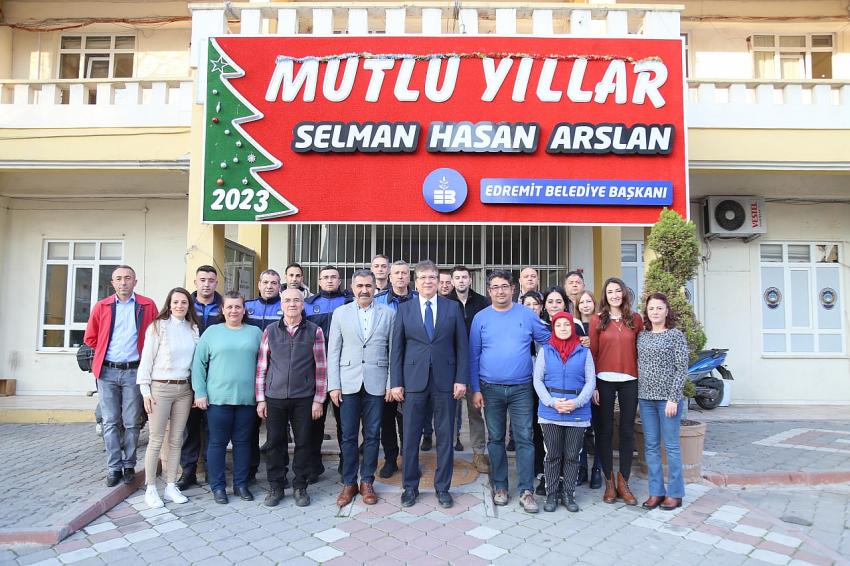Edremit Belediye Başkanı Selman Hasan Arslan, 2022 yılının son iş gününde belediyenin hizmet birimlerini dolaşarak çalışma arkadaşlarının yeni yılını kutladı.