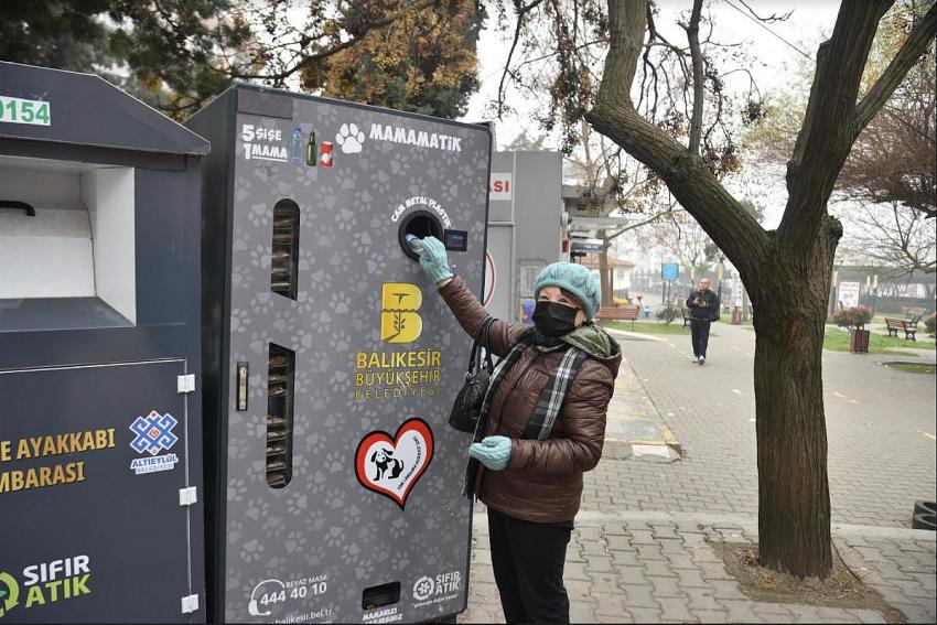 Balıkesir Büyükşehir Belediyesi, bir yandan vatandaşlarda çevre ve sıfır atık bilincini oluşturmak diğer yandan da sokakta, su ve yiyecek bulmakta zorlanan hayvanlar için mamamatik projesini hayat geçirdi. Mamamatik, 5 şişe atık karşılığında mama vererek sokaktaki can dostların beslenmesine katkı sağlıyor.